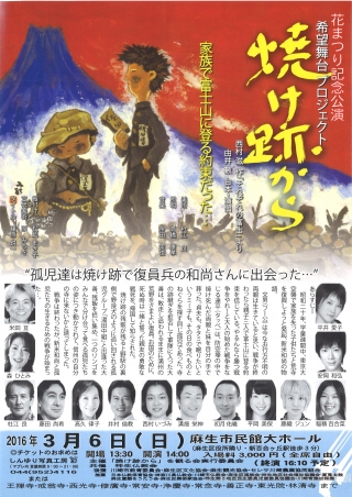 激の舞台は昭和二十年、満州から復員した寺の息子は上野駅で野良犬のように追い回される孤児のグループと出会い、実家の荒れ寺の復興と里親制度の先駆けとなった藤本幸邦住職の物語です。入場料 3、000円問合せ 修廣善寺(しゅこうぜんじ)ご住職 川崎市仏教会会長 菅原節生(せつじょう)老師 電話 044-988-0165